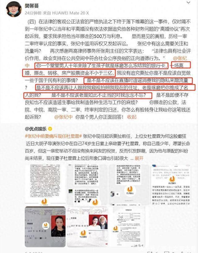 樊馨蔓不仅指控张纪中在婚姻期间出轨,还拿出了实实在在的证据,证明张纪中在离婚前转移了不少于3亿的婚内财产。 最让人震惊的是,樊馨蔓公布的房产过户记录显示, 张纪中把房子过户到了自己和现任妻子杜星霖的名下。
